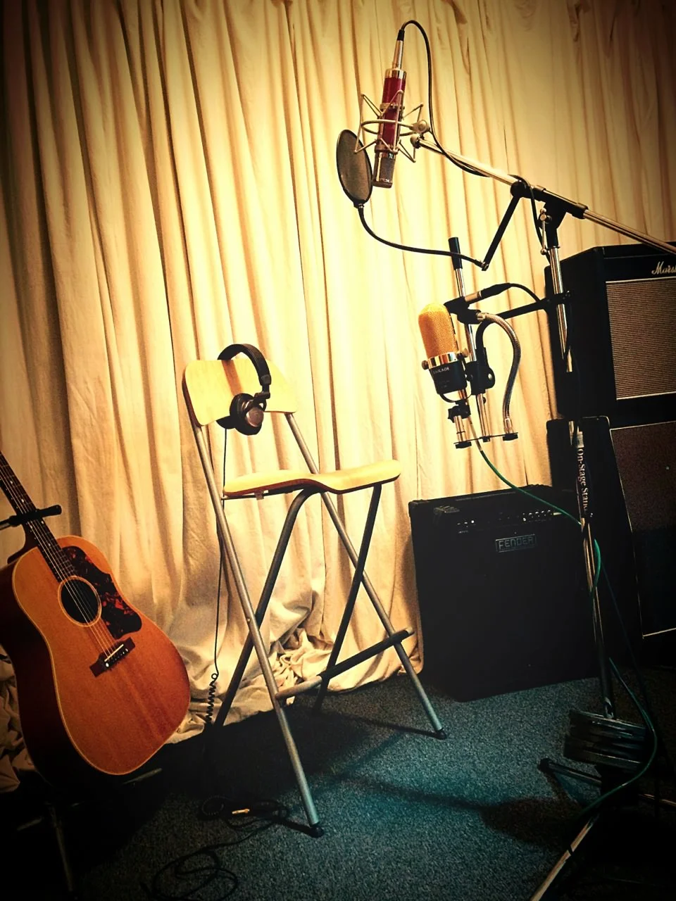 Live room setup: '57 Gibson J-50 acoustic. Avantone CV12 tube condenser on vocal. Victor ribbon & Michael Joly small diaphragm condenser mics for guitar.